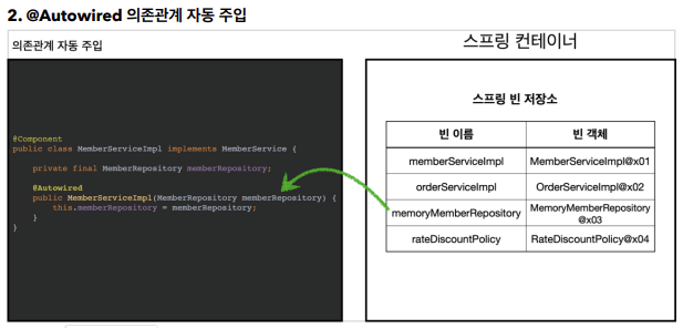 - 생성자에 @Autowired를 지정하면 Spring 컨테이너가 적절한 Spring 빈을 자동으로 찾아 삽입합니다.