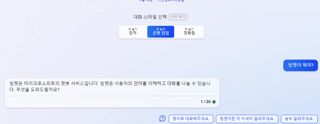 Edge에서 Bing 채팅 화면에 연결되었음을 확인합니다. 현재 Bing Chatbop의 모습을 보실 수 있습니다. 이제부터 Bing 챗봇을 바로 사용할 수 있습니다. 아래 “모두 물어보기” 란에 원하는 질문을 적으면 Chat GPT나 Simsimi처럼 챗스틱이 자동으로 답해주는 시스템입니다.
